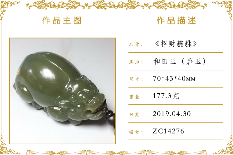 作品名称:招财貔貅(加工)。材质:和田玉(碧玉)。尺寸:70*43*40mm。重量:177.3克