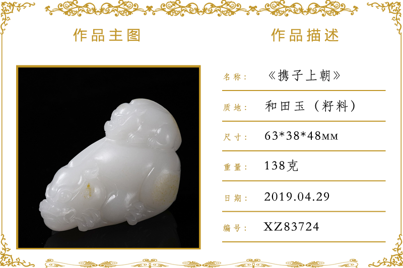 作品名称:携子上朝(加工)。材质:和田玉(籽料)。尺寸:63*38*48mm。重量:138克