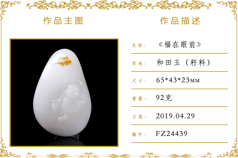 作品名称:福在眼前(加工)。材质:和田玉(籽料)。尺寸:65*43*23mm。重量:92克
