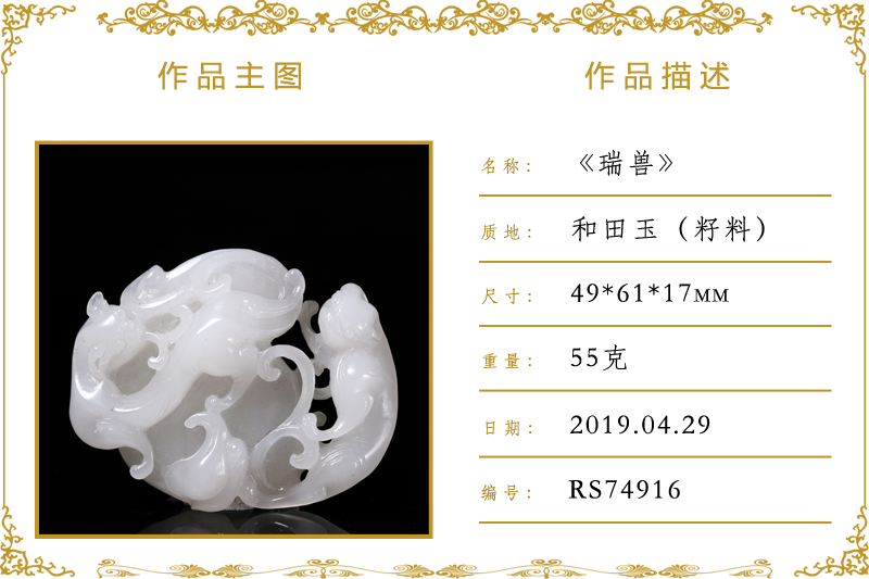 作品名称:瑞兽(加工)。材质:和田玉(籽料)。尺寸:49*61*17mm。重量:55克
