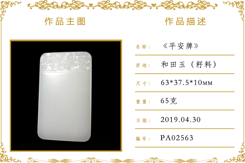 作品名称:平安牌(加工)。材质:和田玉(籽料)。尺寸:63*37.5*10mm。重量:65克