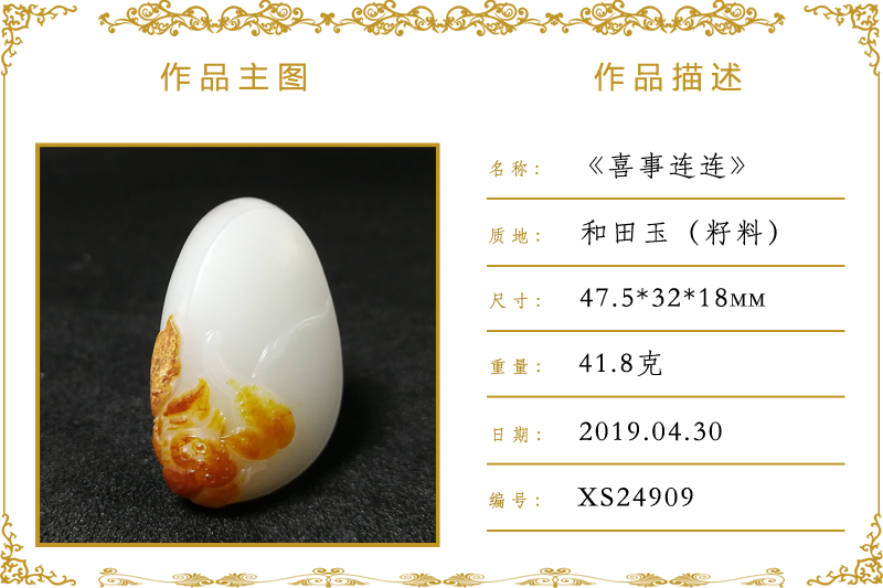 作品名称:喜事连连(加工)。材质:和田玉(籽料)。尺寸:47.5*32*18MM。重量:41.8克