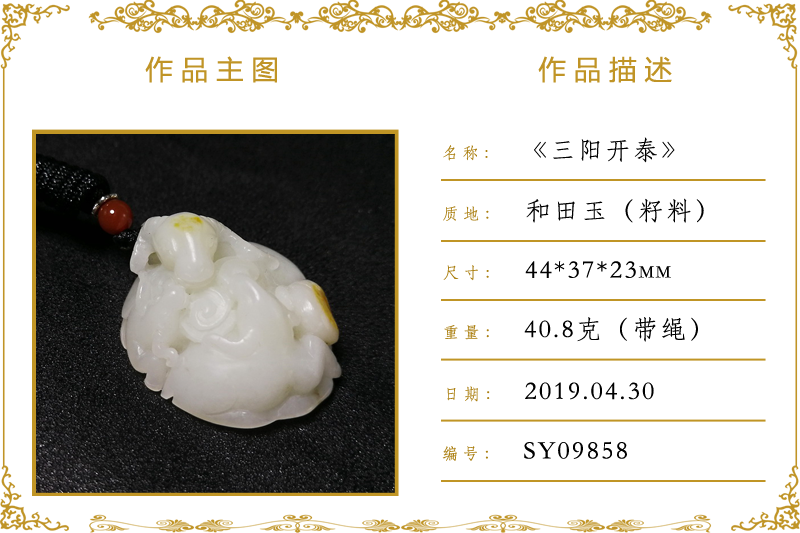 作品名称:三阳开泰(加工)。材质:和田玉(籽料)。尺寸:44*37*23mm。重量:40.8克(带绳)