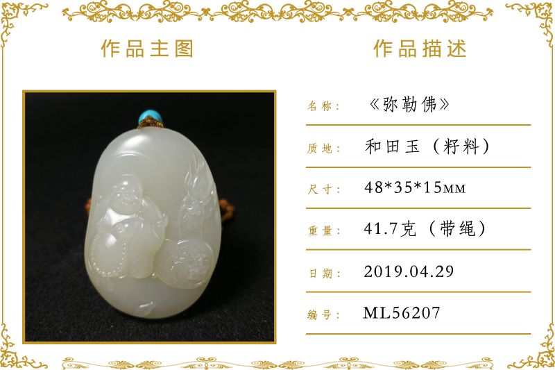 作品名称:弥勒佛(加工)。材质:和田玉(籽料)。尺寸:48*35*15mm。重量:41.7克(带绳)