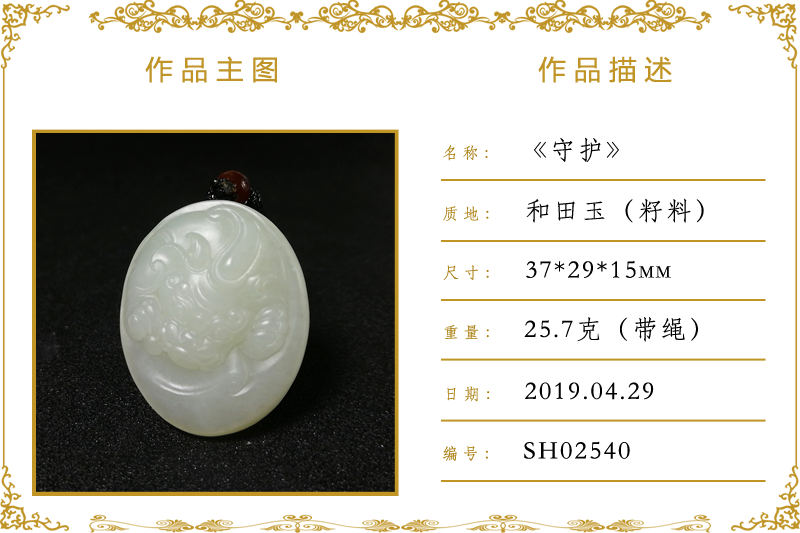 作品名称:守护(加工)。材质:和田玉(籽料)。尺寸:37*29*15mm。重量:25.7克(带绳)