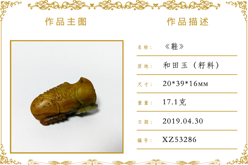 作品名称:鞋(加工)。材质:和田玉(籽料)。尺寸:20*39*16mm。重量:17.1克
