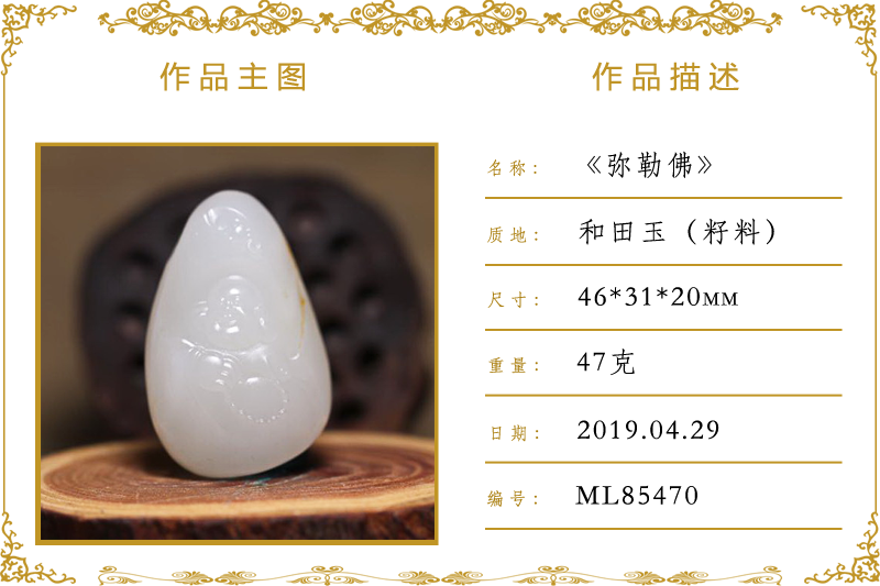 作品名称:弥勒佛(加工)。材质:和田玉(籽料)。尺寸:46*31*20mm。重量:47克