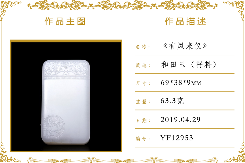 作品名称:有凤来仪(加工)。材质:和田玉(籽料)。尺寸:69*38*9mm。重量:63.3克