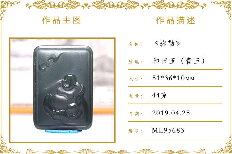 作品名称:弥勒(加工)。材质:和田玉(青玉)。尺寸:51*36*10mm。重量:44克