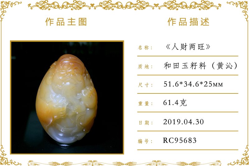 作品名称:人财两旺(加工)。材质:和田玉籽料(黄沁)。尺寸:51.6*34.6*25mm。重量:61.4克