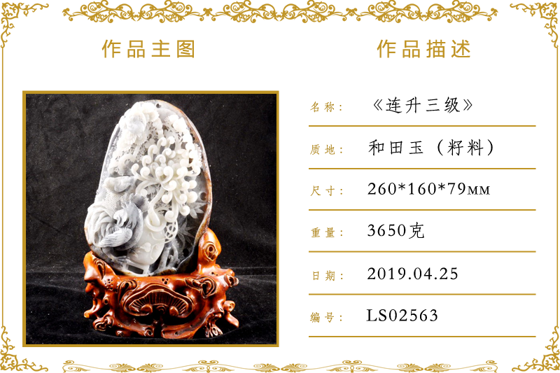 作品名称:连升三级(加工)。材质:和田玉(加工)。尺寸:260*160*79mm。重量:3650克