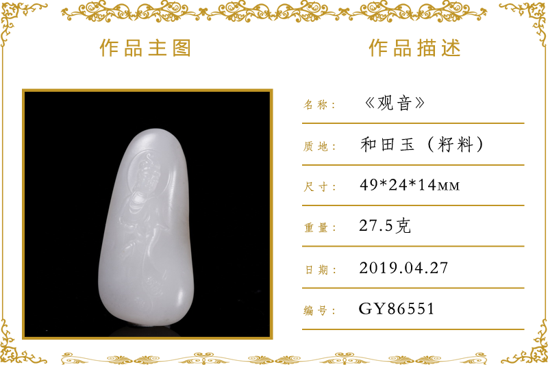 作品名称:观音(加工)。材质:和田玉(籽料)。尺寸:49*24*14mm。重量:27.5克