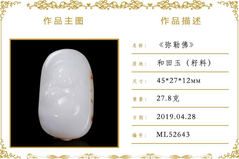 作品名称:弥勒佛(加工)。材质:和田玉(籽料)。尺寸:45*27*12mm。重量:27.8克