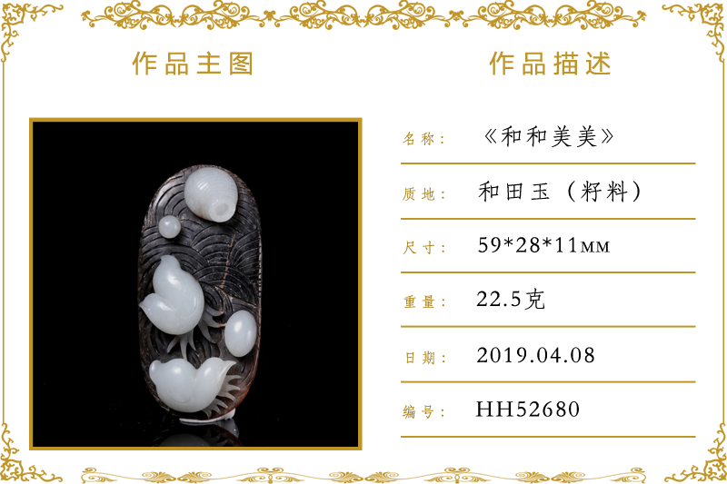 作品名称:和和美美(加工)。材质:和田玉(籽料)。尺寸:59*28*11mm。重量:22.5克
