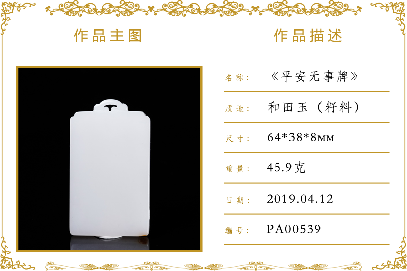 作品名称:平安无事牌(加工)。材质:和田玉(籽料)。尺寸:64*38*8mm。重量:45.9克