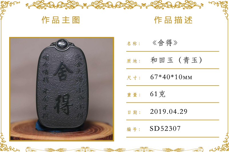 作品名称:舍得(加工)。材质:和田玉(籽料)。尺寸:67*40*10mm。重量:61克