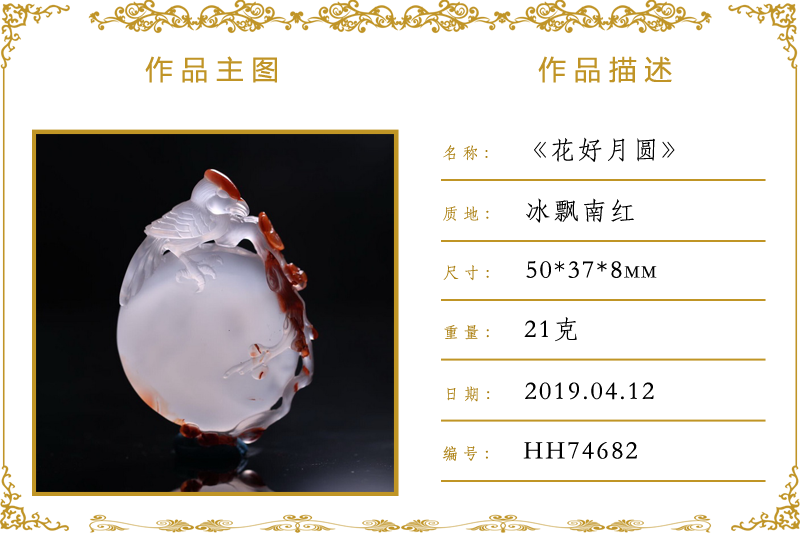 作品名称:花好月圆(加工)。材质:冰飘南红。尺寸:50*37*8mm。重量:21克