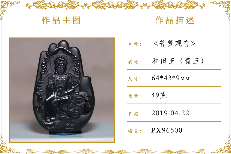 作品名称:普贤观音(加工)。材质:和田玉(青玉)。尺寸:64*43*9mm。重量:49克
