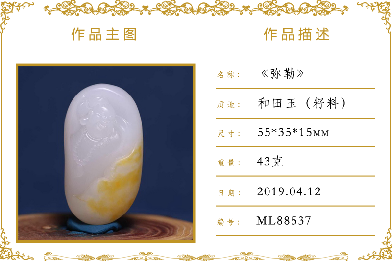 作品名称:弥勒(加工)。材质:和田玉(籽料)。尺寸:55*35*15mm。重量:43克