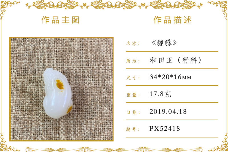 作品名称:貔貅(加工)。材质:和田玉(籽料)。尺寸:34*20*16mm。重量:17.8克