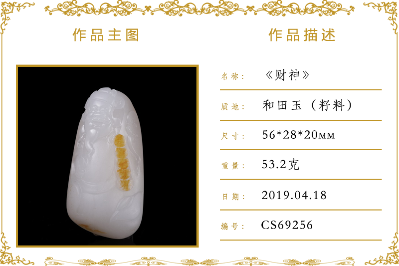 作品名称:财神(加工)。材质:和田玉(籽料)。尺寸:56*28*20mm。重量:53.2克