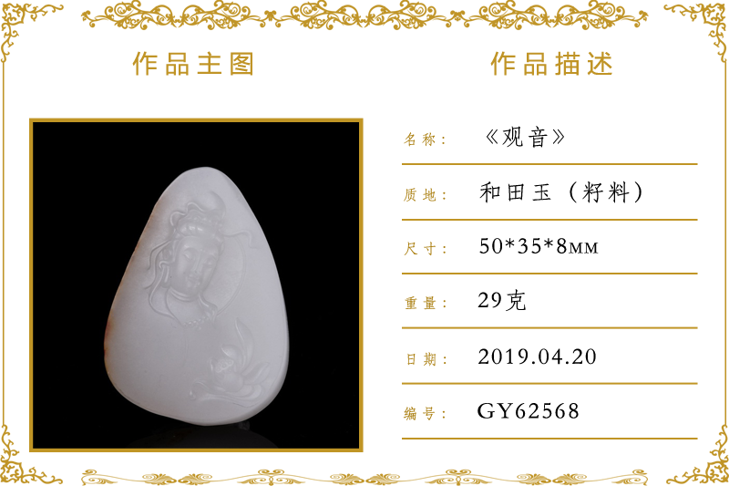 作品名称:观音(加工)。材质:和田玉(籽料)。尺寸:50*35*8mm。重量:29克