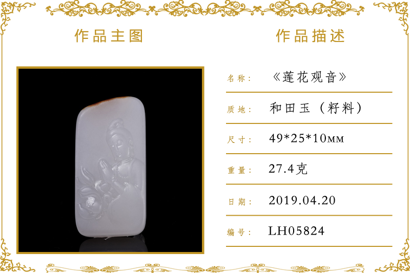 作品名称:莲花观音(加工)。材质:和田玉(籽料)。尺寸:49*25*10mm。重量:27.4克