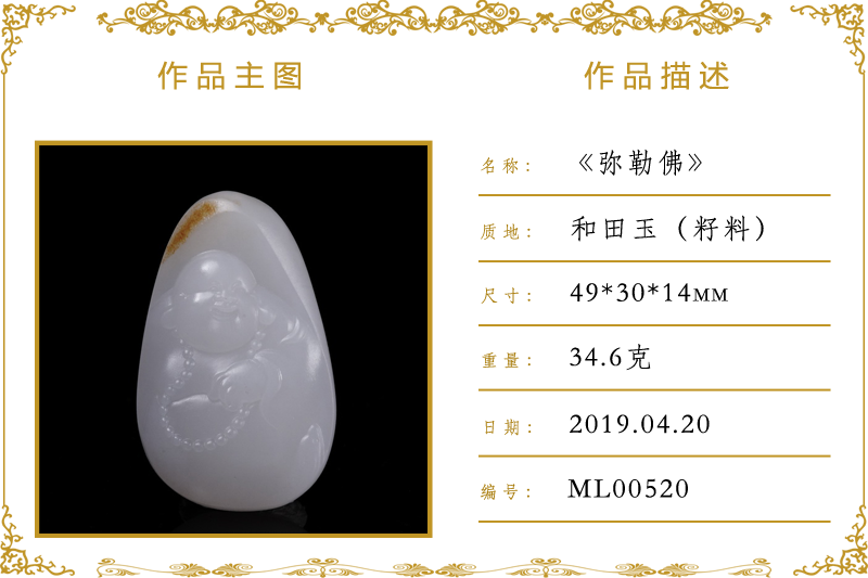 作品名称:弥勒佛(加工)。材质:和田玉(籽料)。尺寸:49*30*14mm。重量:34.6克