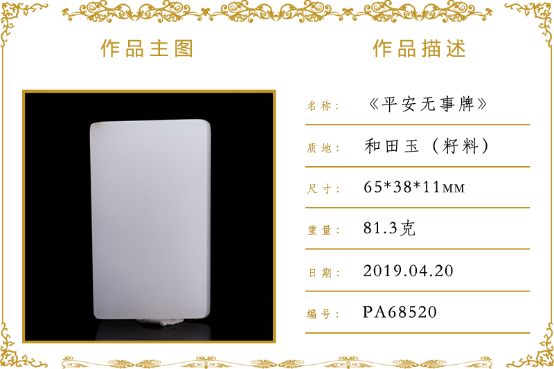 作品名称:平安无事牌(加工)。材质:和田玉(籽料)。尺寸:65*38*11mm。重量:81.3克