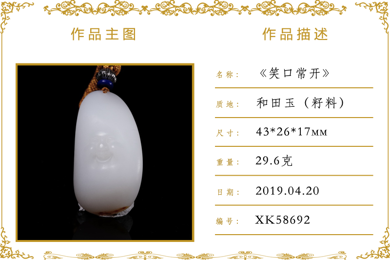 作品名称:笑口常开(加工)。材质:和田玉(籽料)。尺寸:43*26*17mm。重量:29.6克