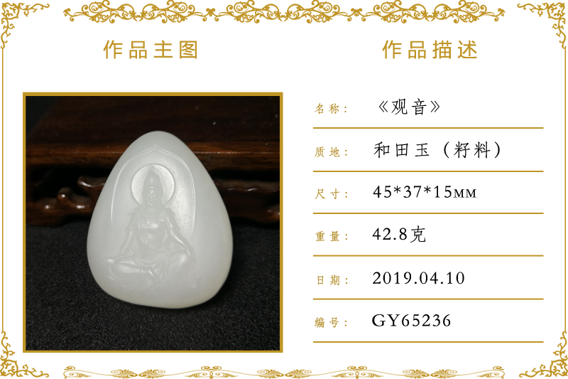 作品名称:观音(加工)。材质:和田玉(籽料)。尺寸:45*37*15mm。重量:42.8克
