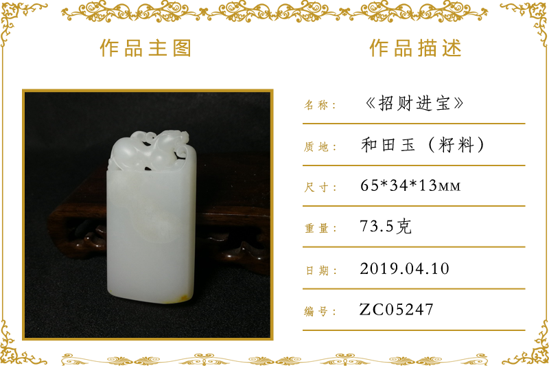 作品名称:招财进宝(加工)。材质:和田玉(籽料)。尺寸:65*34*13mm。重量:73.5克