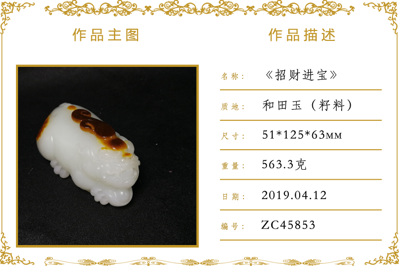 作品名称:招财进宝(加工)。材质:和田玉(籽料)。尺寸:51*125*63mm。重量:563.3克。
