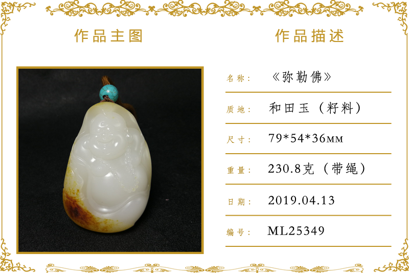 作品名称:弥勒佛(加工)。材质:和田玉(籽料)。尺寸:79*54*36mm。重量:230.8克(带绳)。