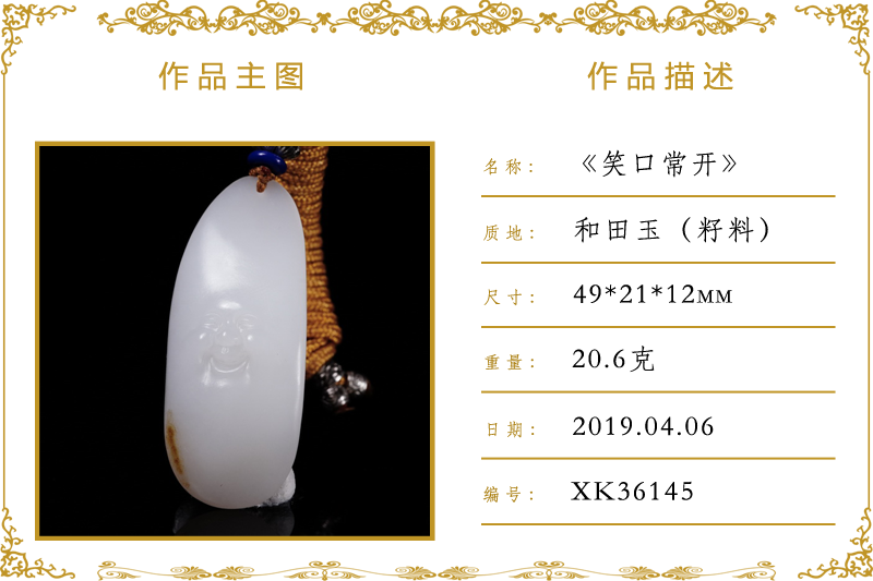 作品名称:笑口常开(加工)。材质:和田玉(籽料)。尺寸:49*21*12mm。重量:20.6克