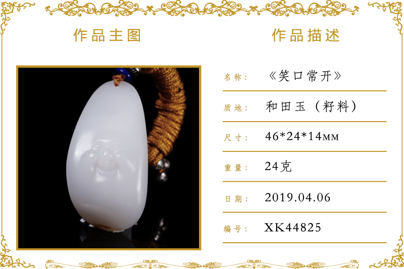 作品名称:笑口常开(加工)。材质:和田玉(籽料)。尺寸:46*24*14mm。重量:24克