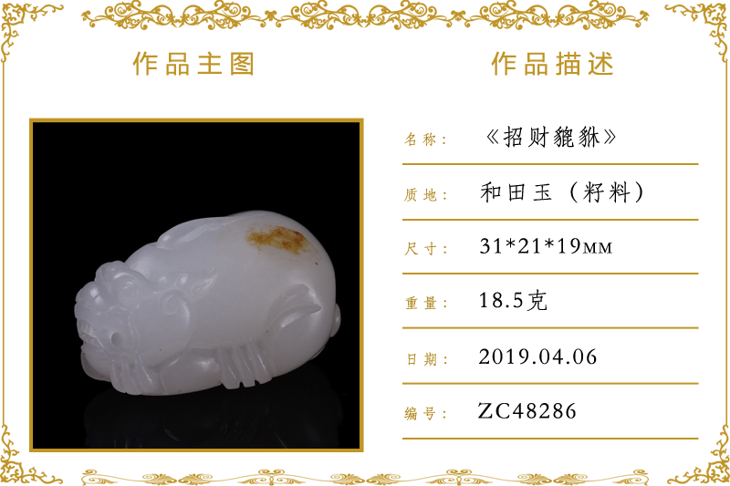 作品名称:招财貔貅(加工)。材质:和田玉(籽料)。尺寸:31*21*19mm。重量:18.5克