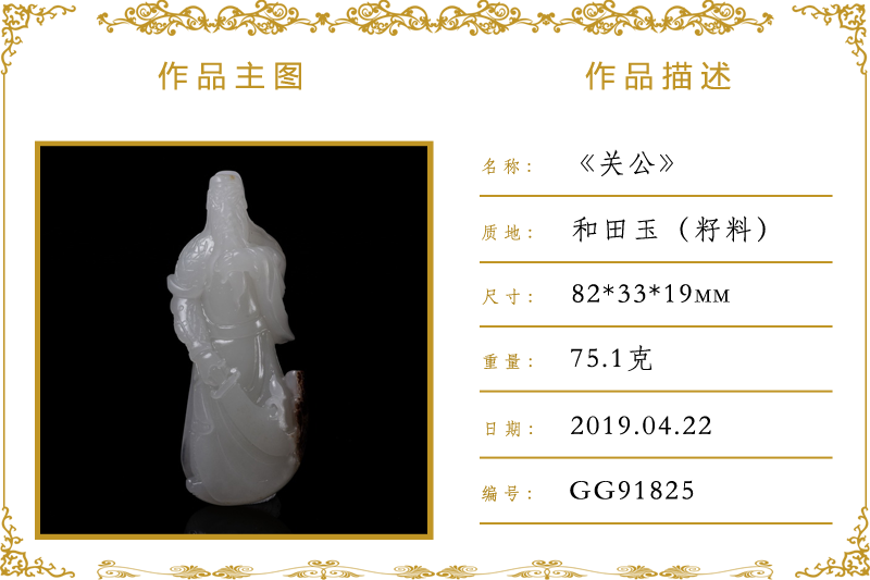 作品名称:关公(加工)。材质:和田玉(籽料)。尺寸:82*33*19mm。重量:75.1克