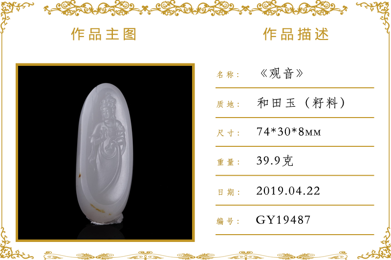 作品名称:观音(加工)。材质:和田玉(籽料)。尺寸:74*30*8mm。重量:39.9克