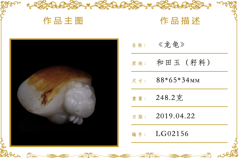 作品名称:龙龟(加工)。材质:和田玉(籽料)。尺寸:88*65*34mm。重量:248.2克
