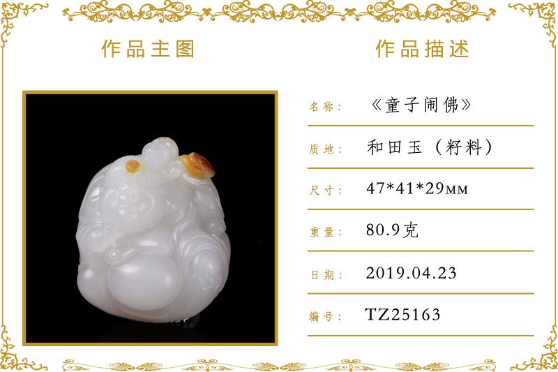 作品名称:童子闹佛(加工)。材质:和田玉(籽料)。尺寸:47*41*29mm。重量:80.9克