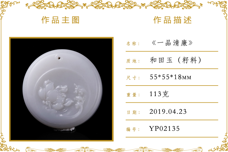 作品名称:一品清廉(加工)。材质:和田玉(籽料)。尺寸:55*55*18mm。重量:113克