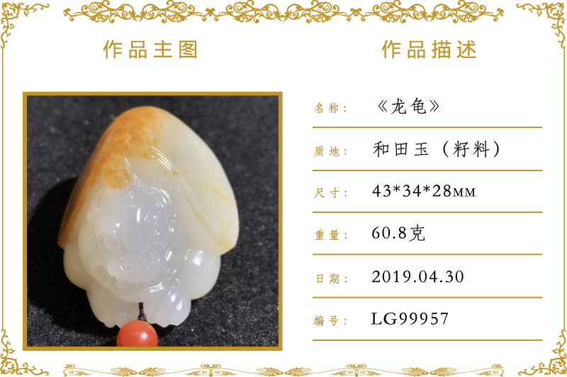 作品名称:龙龟(加工)。材质:和田玉(籽料)。尺寸:43*34*28mm。重量:60.8克
