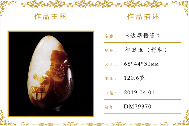 作品名称:达摩悟道(加工)。材质:和田玉(籽料)。尺寸:68*44*30mm。重量:120.6克