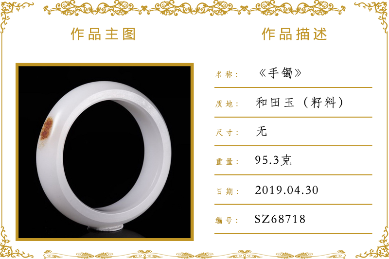 作品名称:手镯(加工)。材质:和田玉(籽料)。尺寸:无。重量:95.3克