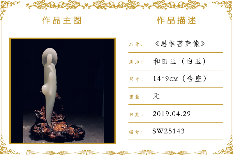 作品名称:思惟菩萨像(加工)。材质:和田玉(白玉)。尺寸:14*9cm(含座)。重量:无